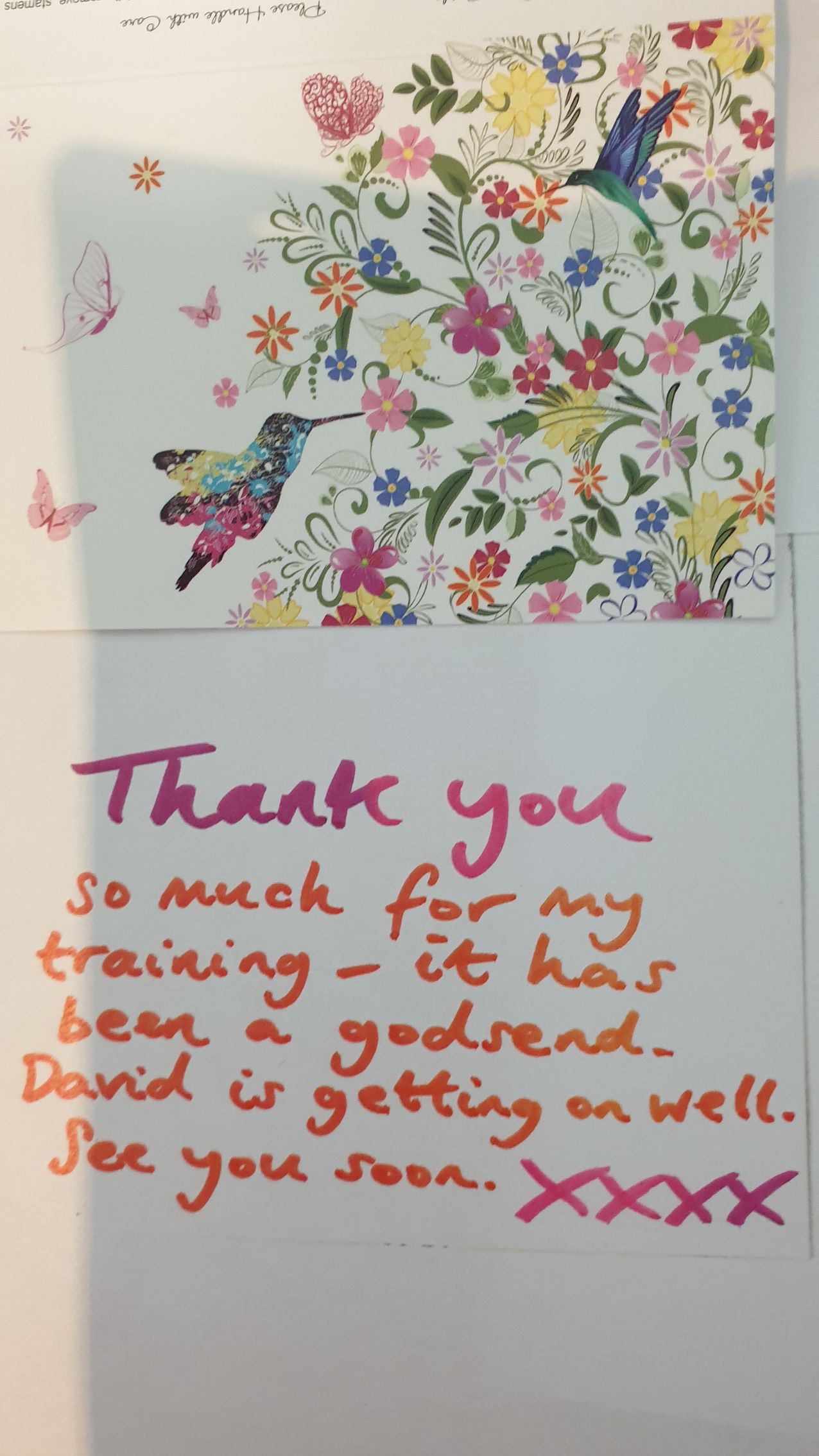 A lovely thank you card following training given to assist a loved one with moving and assisting